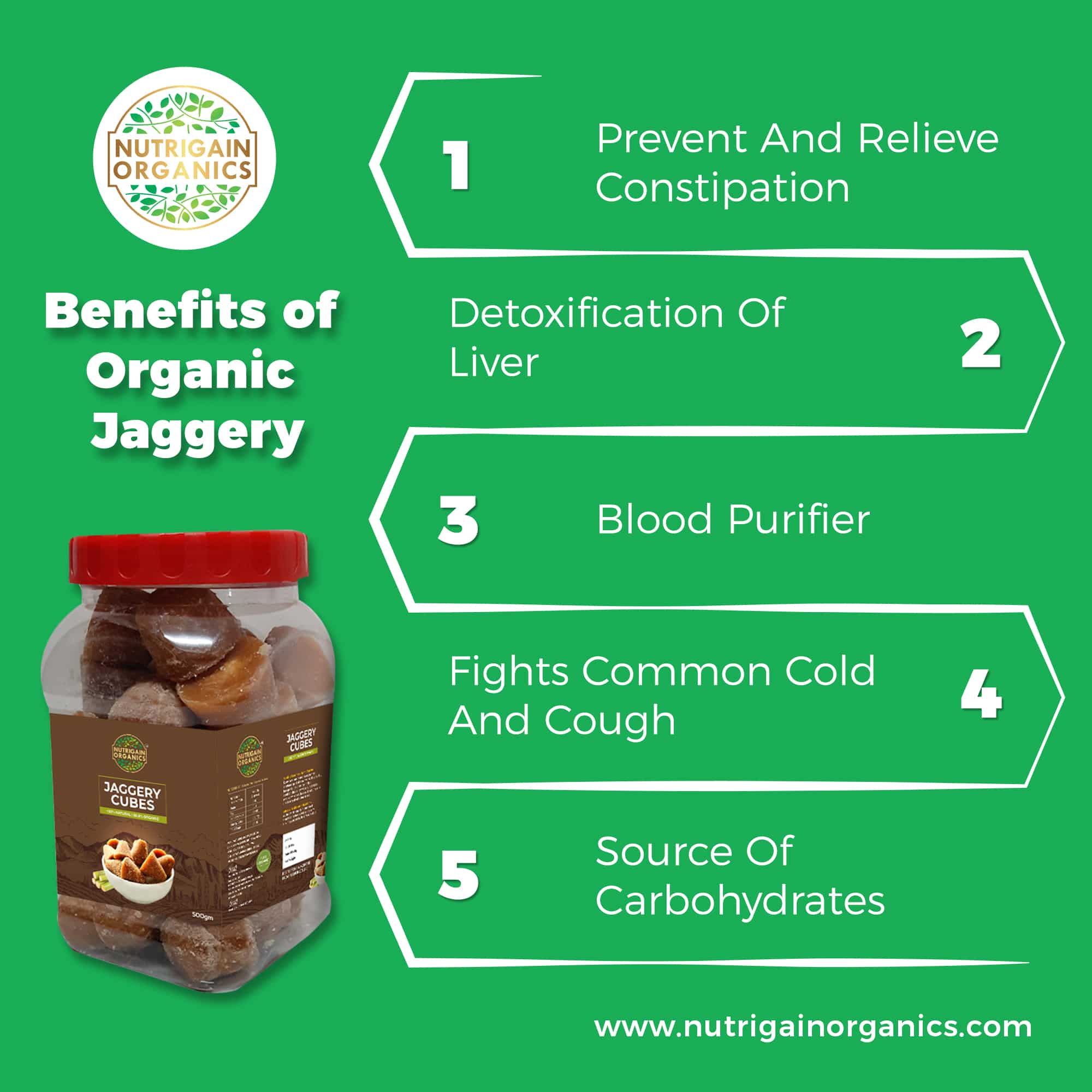 cious honey- brown Jaggery is a 99.9 percent natural and chemical-free sweetener. Rich in minerals, it is sourced from the sweetest & softest variety of sugarcanes organically grown. Replace sugar and add organic jaggery to your list of sweets or beverages to strengthen your immunity. Also available in jaggery cubes, it has no synthetic preservatives. It acts as a detoxifying agent, and has multiple other health benefits that help you in digestion, resisting infections and preventing constipation.